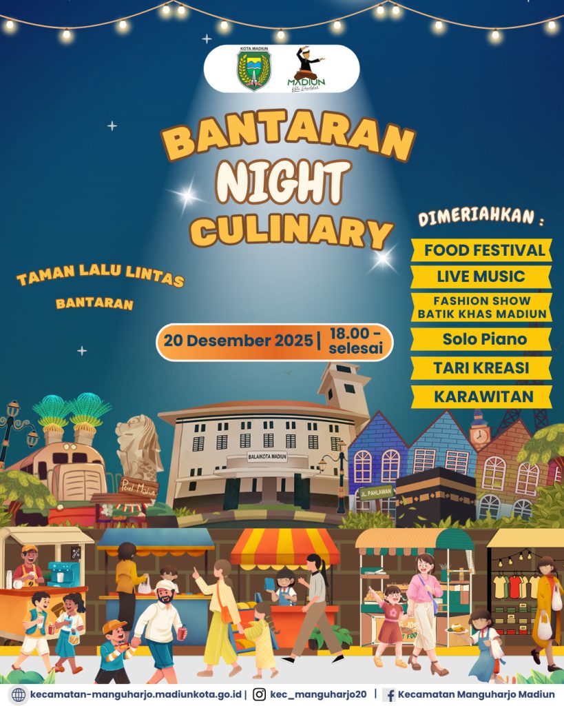 Dalam rangka menghidupkan perekonomian masyarakat serta memberikan ruang hiburan dan kreativitas bagi warga, Pemerintah Kota Madiun melalui Kecamatan Manguharjo akan menyelenggarakan kegiatan Bantaran Night Culinary yang berlokasi di Taman Lalu Lintas Bantaran.