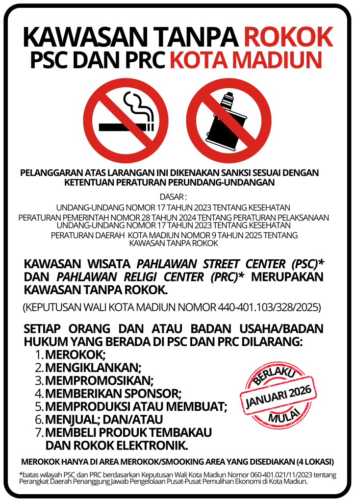 Mulai 1 Januari 2026, Pemkot Madiun menerapkan kebijakan melarang merokok (termasuk rokok elektronik) di kawasan Pahlawan Street Center (PSC) dan Pahlawan Religi Center (PRC). Kebijakan ini untuk mewujudkan lingkungan yang sehat dan mendukung penerapan kawasan bebas asap rokok di area publik.