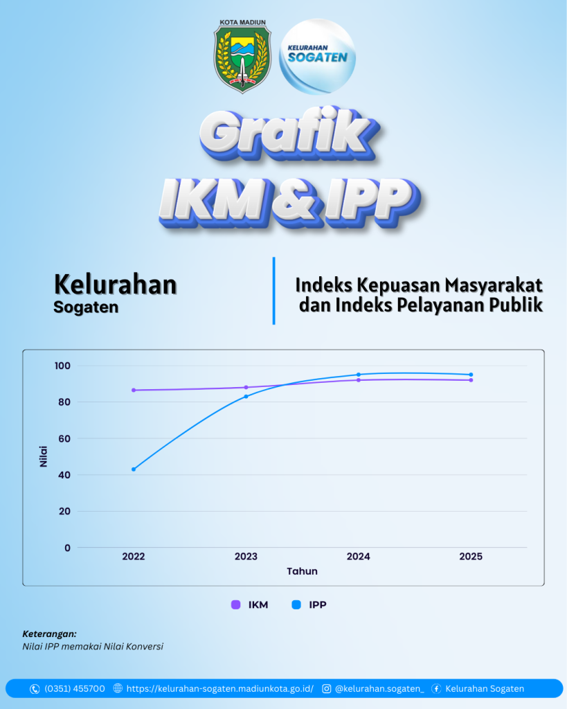 Grafik ini menunjukkan tren peningkatan Indeks Kepuasan Masyarakat (IKM) dan Indeks Pelayanan Publik (IPP) Kelurahan Sogaten dari tahun ke tahun. Hasil ini mencerminkan komitmen kami dalam meningkatkan kualitas pelayanan publik secara berkelanjutan.